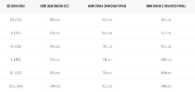 | Veličinski broj | Obim grudi (najširi deo) | Obim Struka (4cm iznad pupka) | Obim bokova (10cm ispod pupka) |