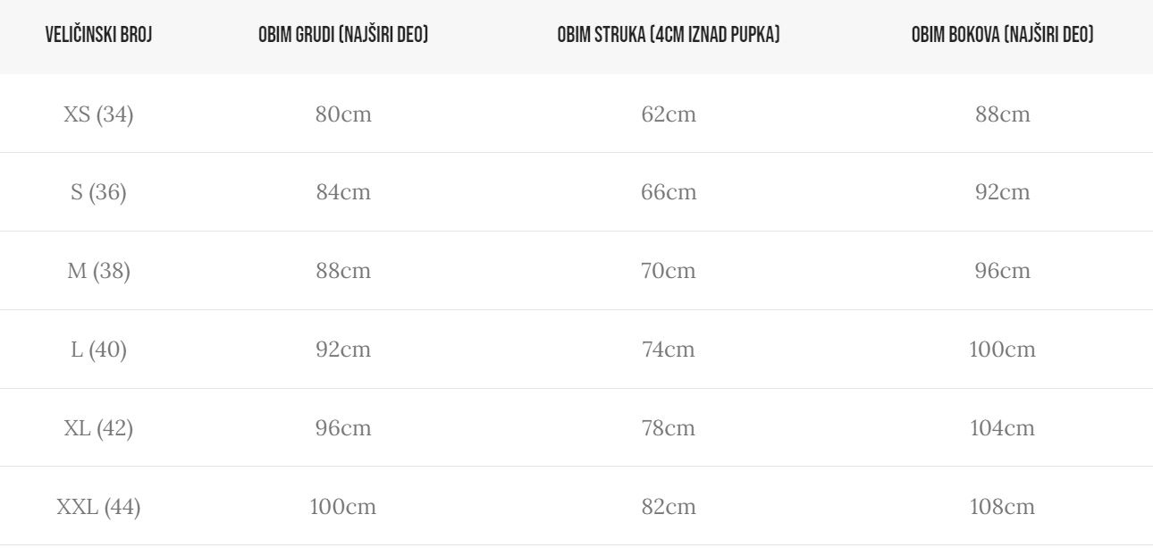 Veličinski broj Obim grudi (najširi deo) Obim struka (4cm iznad pupka) Obim bokova (najširi deo)